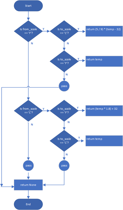 What follows next is the code that implements the function. It contains logic that is very similar to the previous assignment. The logic difference is that the calling program must provide both the input and output scales, and allows the scales to be the same, e.g. "F" in and "F" out is okay, instead of considering it to be an error. If there is a problem with one of the scales, the function returns None, rather than the converted temperature. Other than the return statement, the only the pass statement is new; it specifies that nothing further happens in the block and the program execution flows to the next statement.