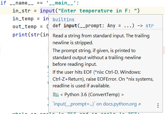 The argument to the input function is the string that you want to prompt the user to a value on the keyboard. The return value is a string that contains what the user typed. If you aren’t sure what a built-in function does, you can hover over the use of the function in program: